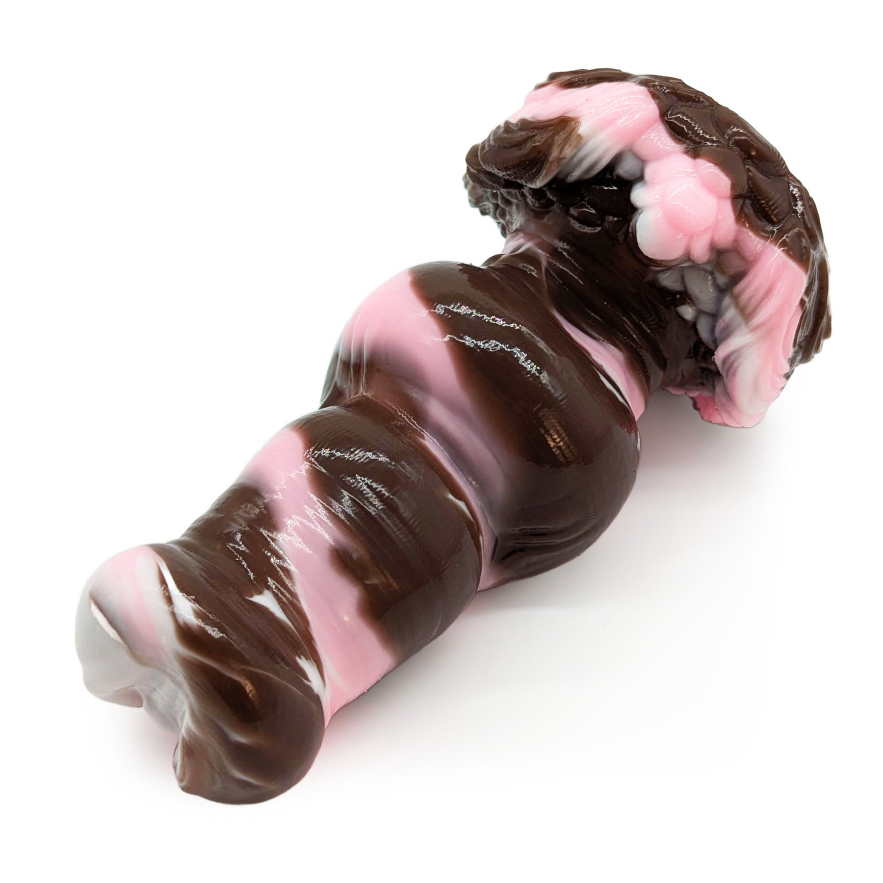 The Nue’s extremely blunt, rounded head leads to a lightly textured upper shaft with a soft swell followed by a thick, spherical knot and ribbed post-knot shaft. His intricately detailed base features rows of stimulating scales to grind on.