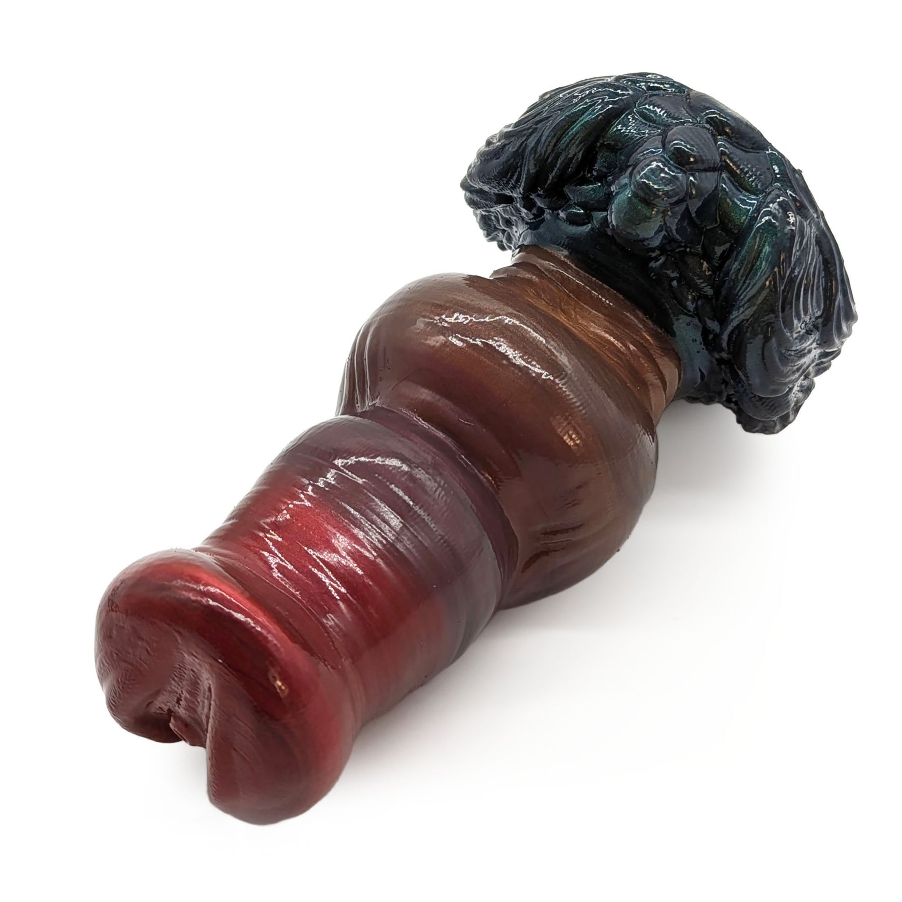 The Nue’s extremely blunt, rounded head leads to a lightly textured upper shaft with a soft swell followed by a thick, spherical knot and ribbed post-knot shaft. His intricately detailed base features rows of stimulating scales to grind on.