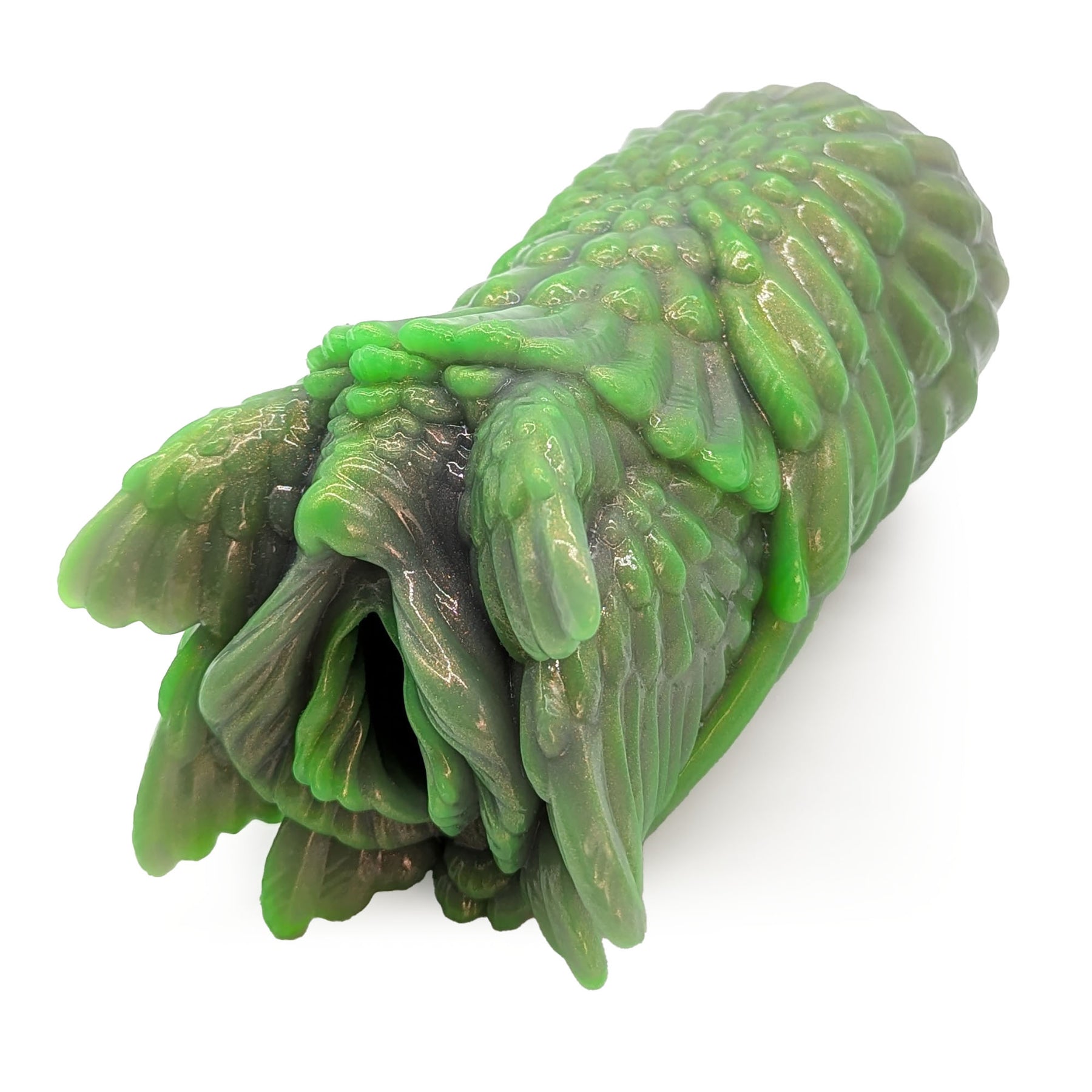 Odette features a beautifully ornate sheath lined with delicately detailed feathers and clasped wings, culminating in a textured, winglet-lined face, inviting lips, and a heavily hooded clitoris.