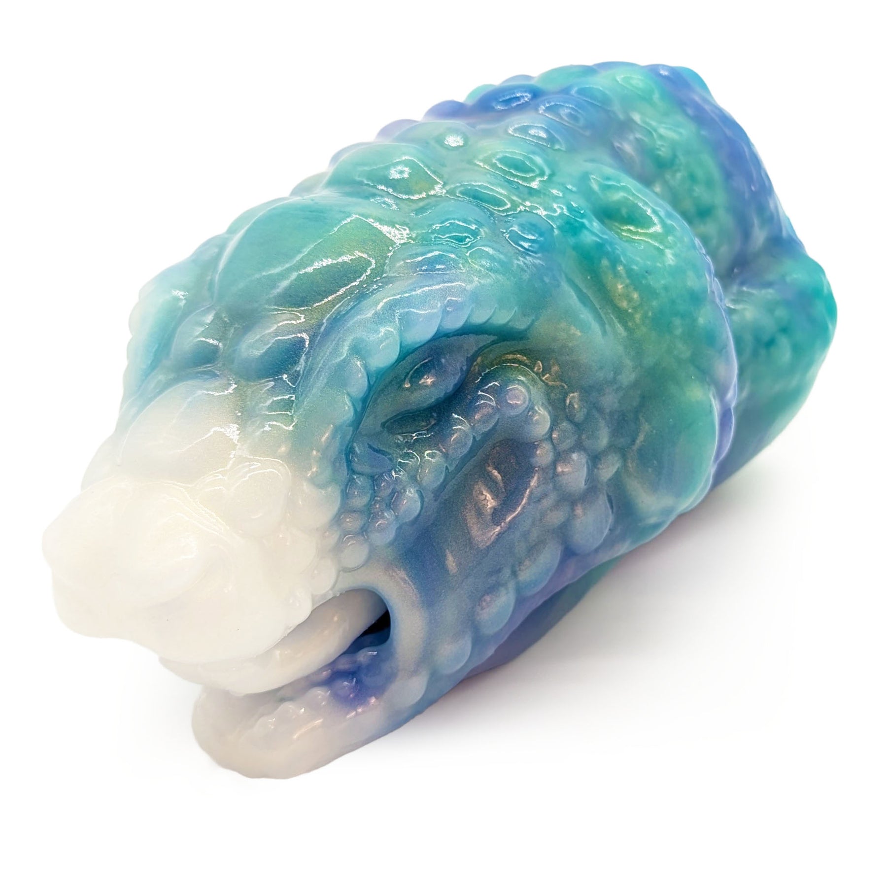 His incredibly unique internal passage includes a realistically free-floating tongue which creates two accessible pockets for penetration. The upper portion features swirling nubbed textures and stimulating ridges while the lower jaw’s textures are more smooth and subdued for a gentler