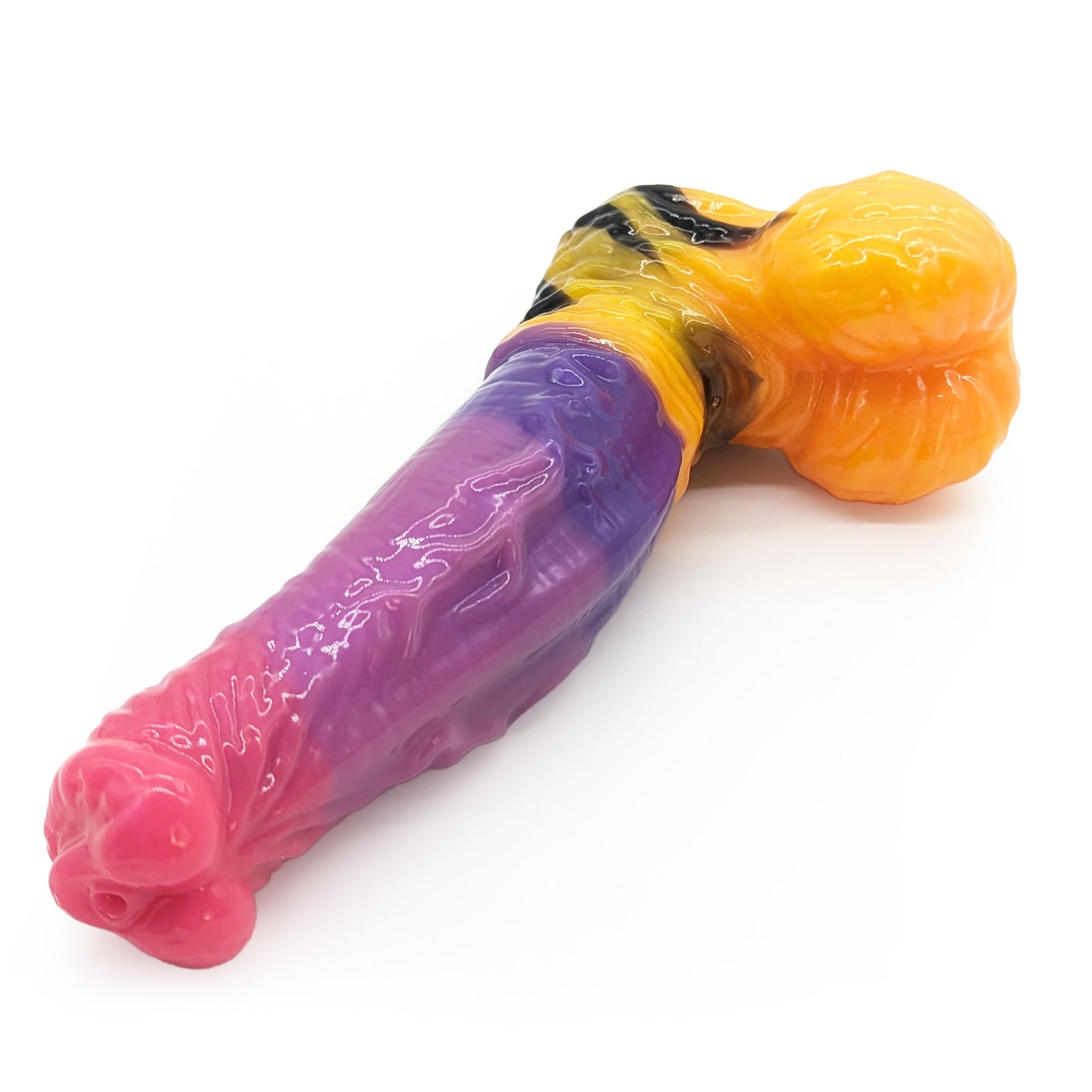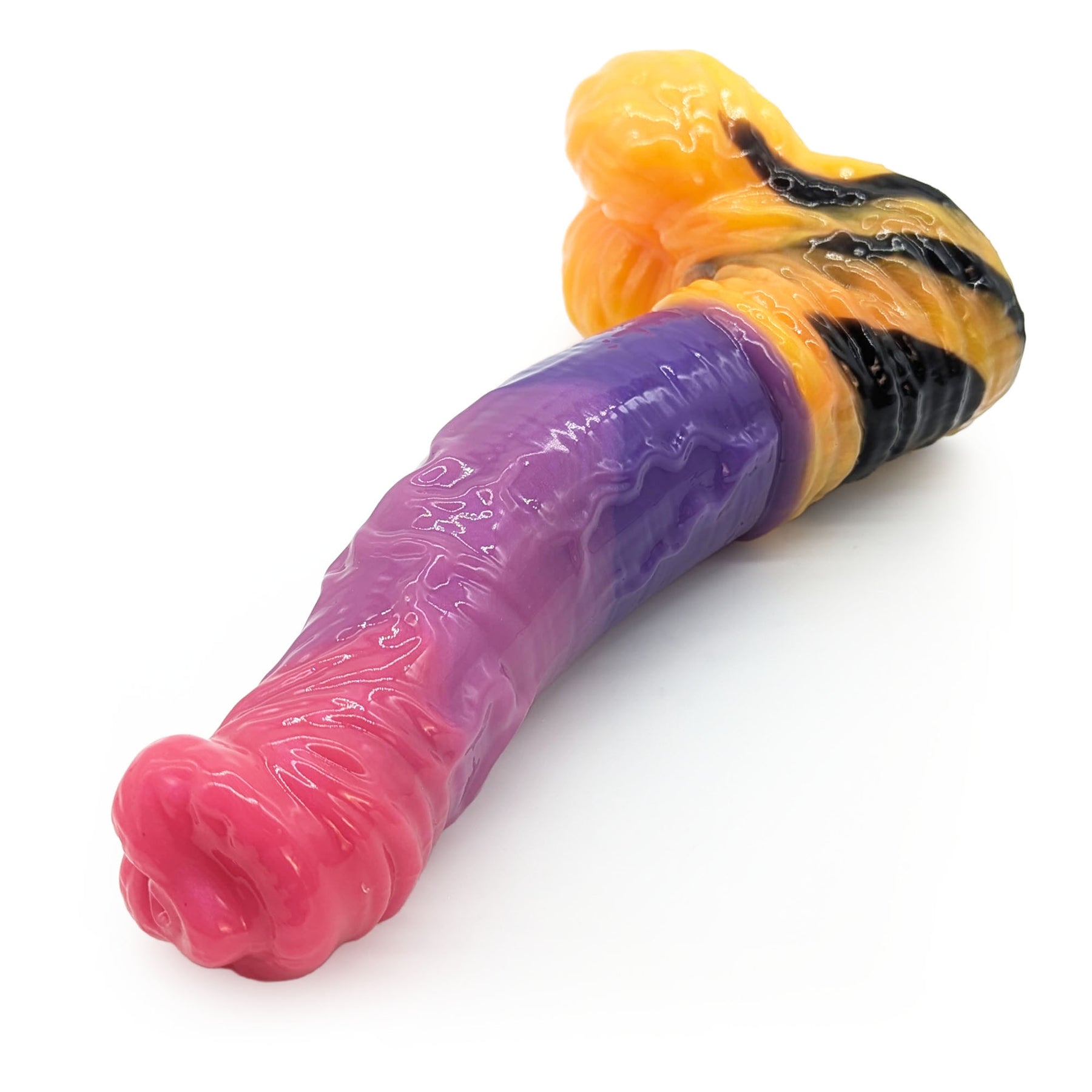 A towering figure, the Red Bull is a surprisingly beginner-friendly, if imposing, partner! Featuring a reversely flared head, deliciously veined shaft, and a wonderfully stout, wrinkly base, his smooth curves, lower swell, and mild texturing are sure to delight!