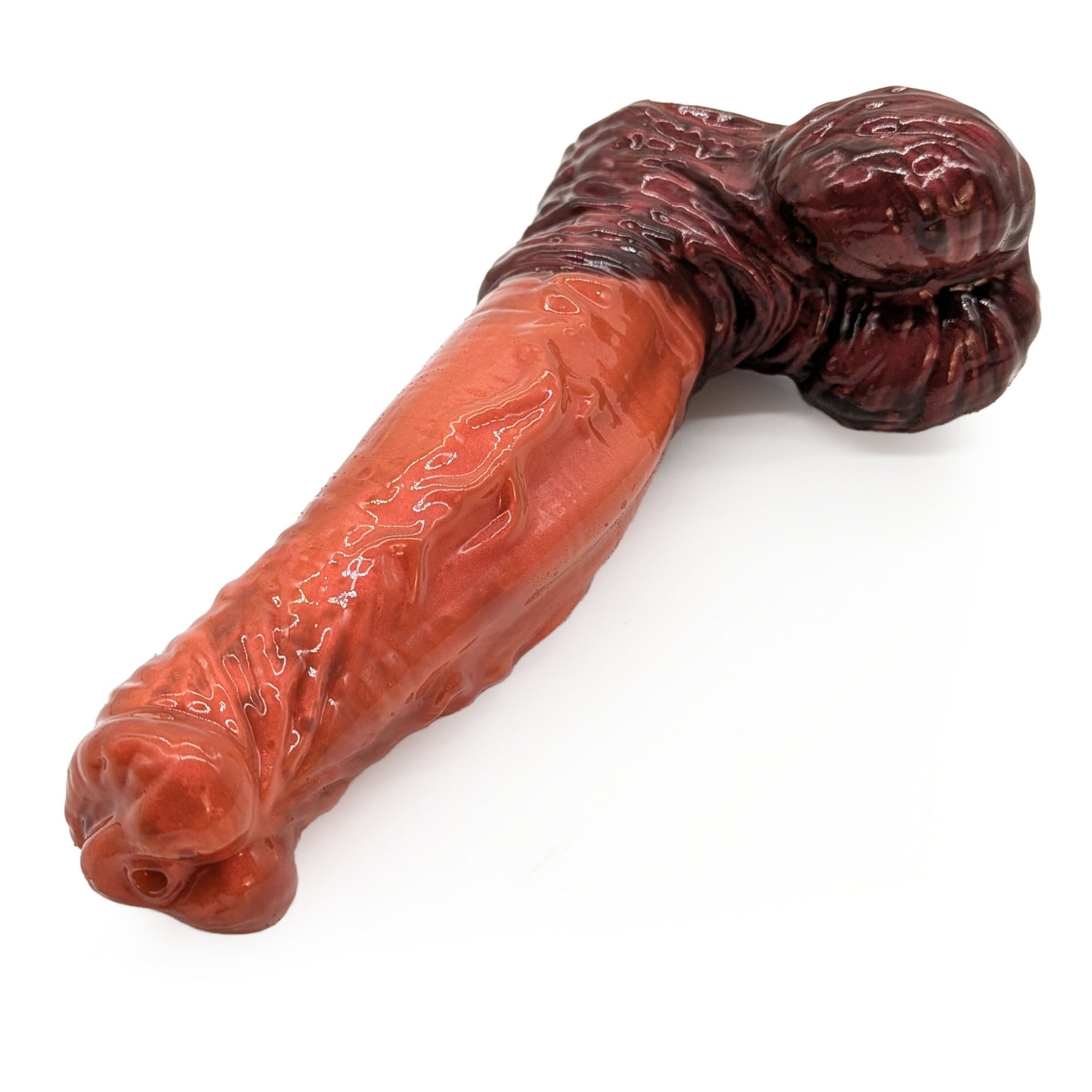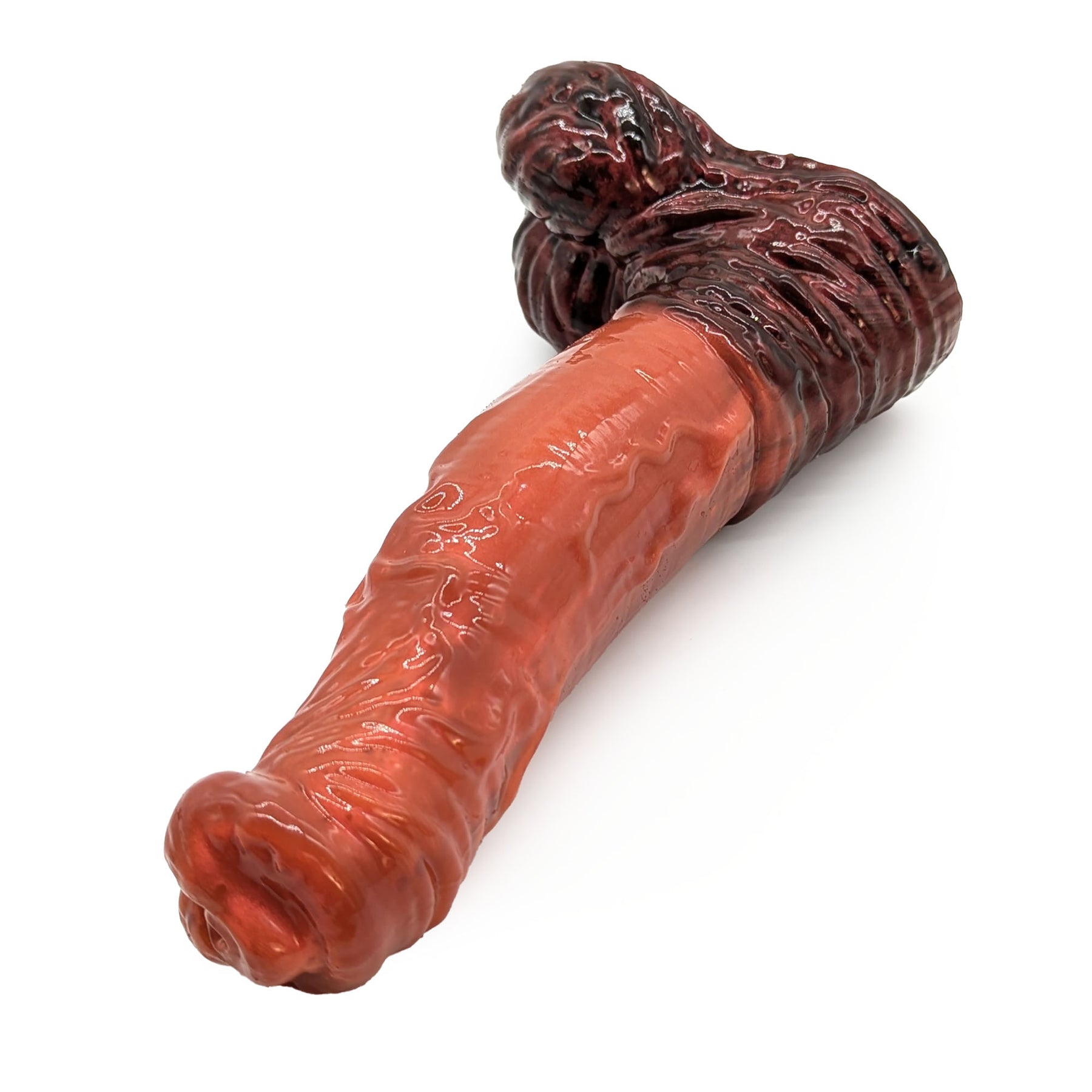 A towering figure, the Red Bull is a surprisingly beginner-friendly, if imposing, partner! Featuring a reversely flared head, deliciously veined shaft, and a wonderfully stout, wrinkly base, his smooth curves, lower swell, and mild texturing are sure to delight!
