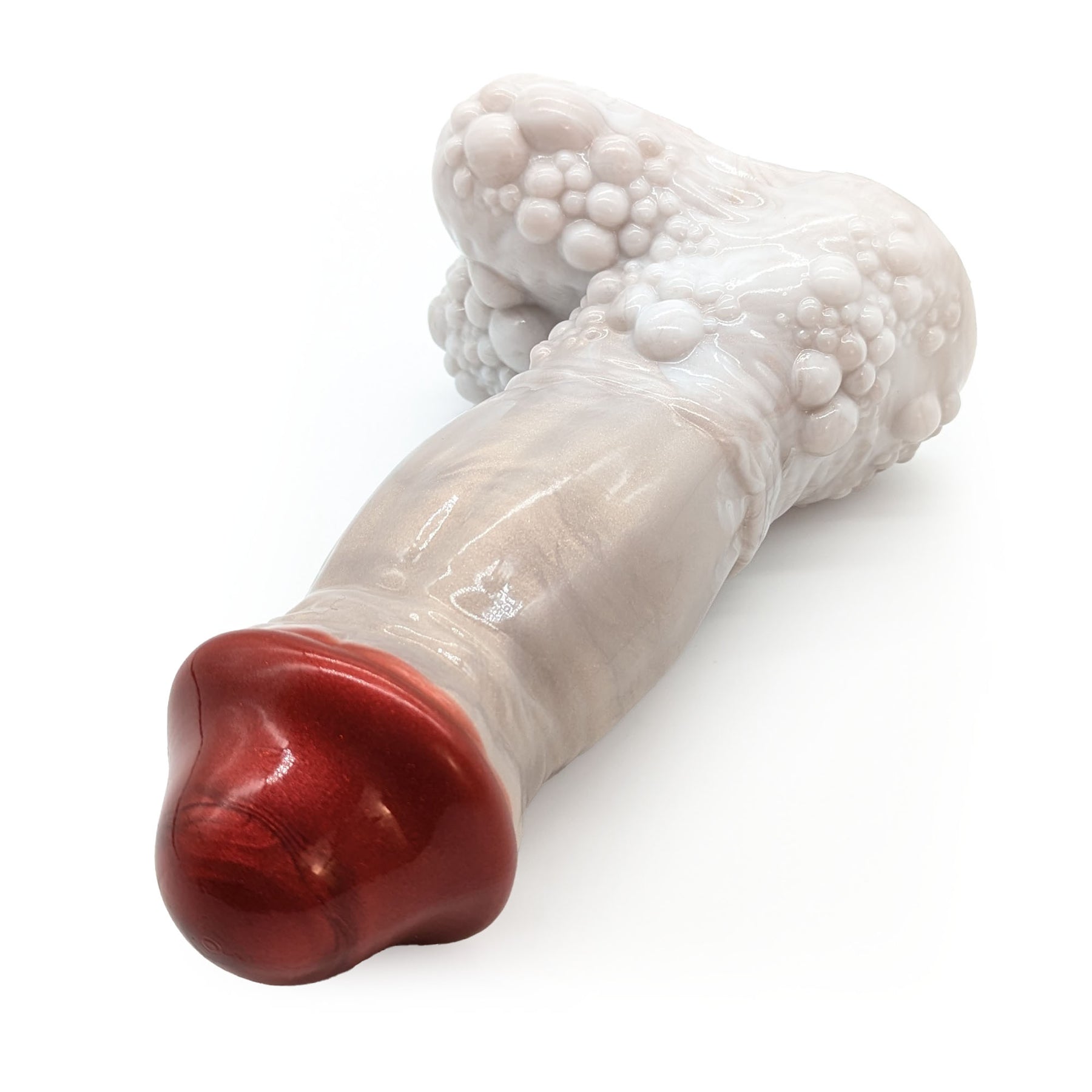 His thick, ribbed shaft is slightly curved with a gentle mid-shaft swell for some delicious push and pull. He ends in a fanciful carpet of mini-shrooms for added external stimulation.