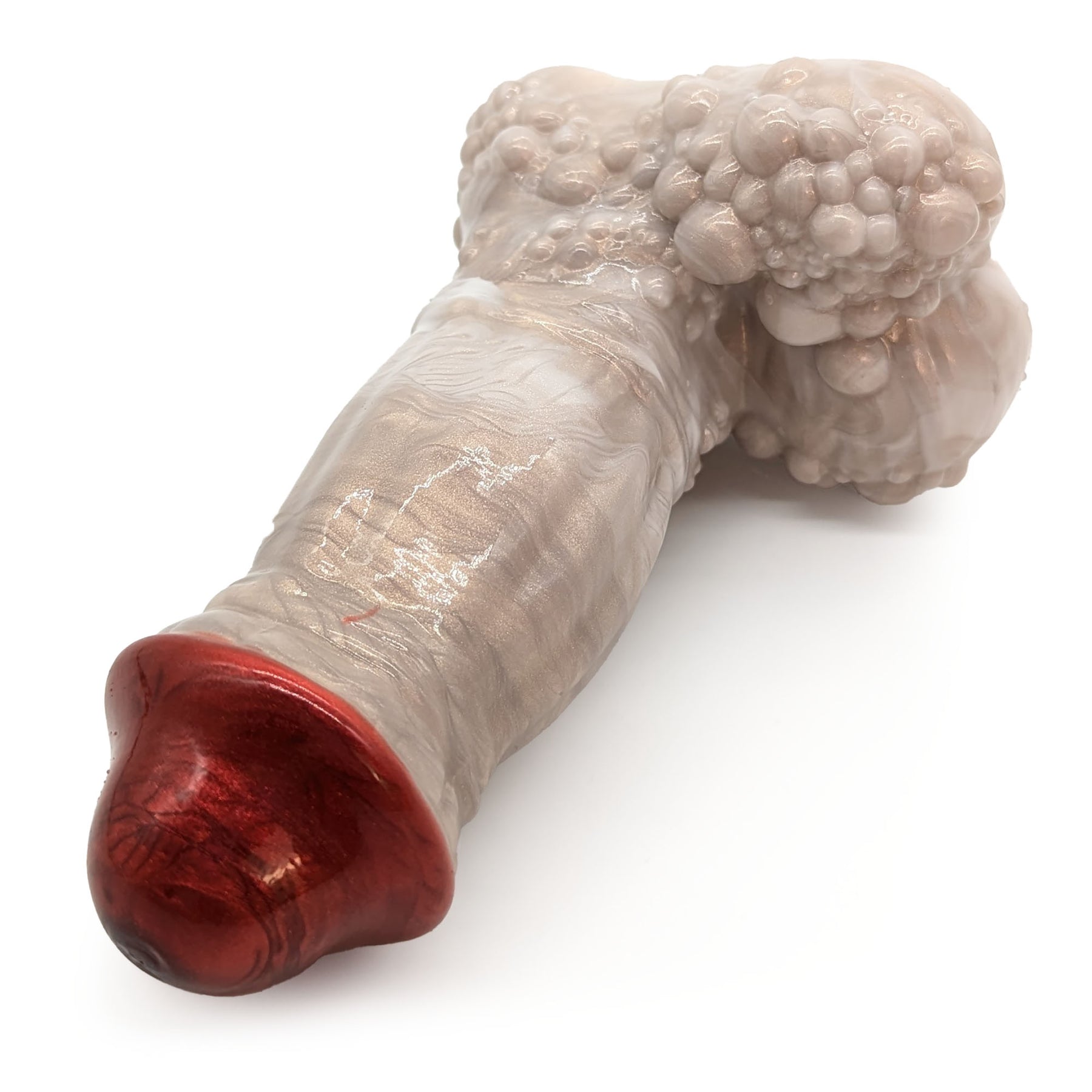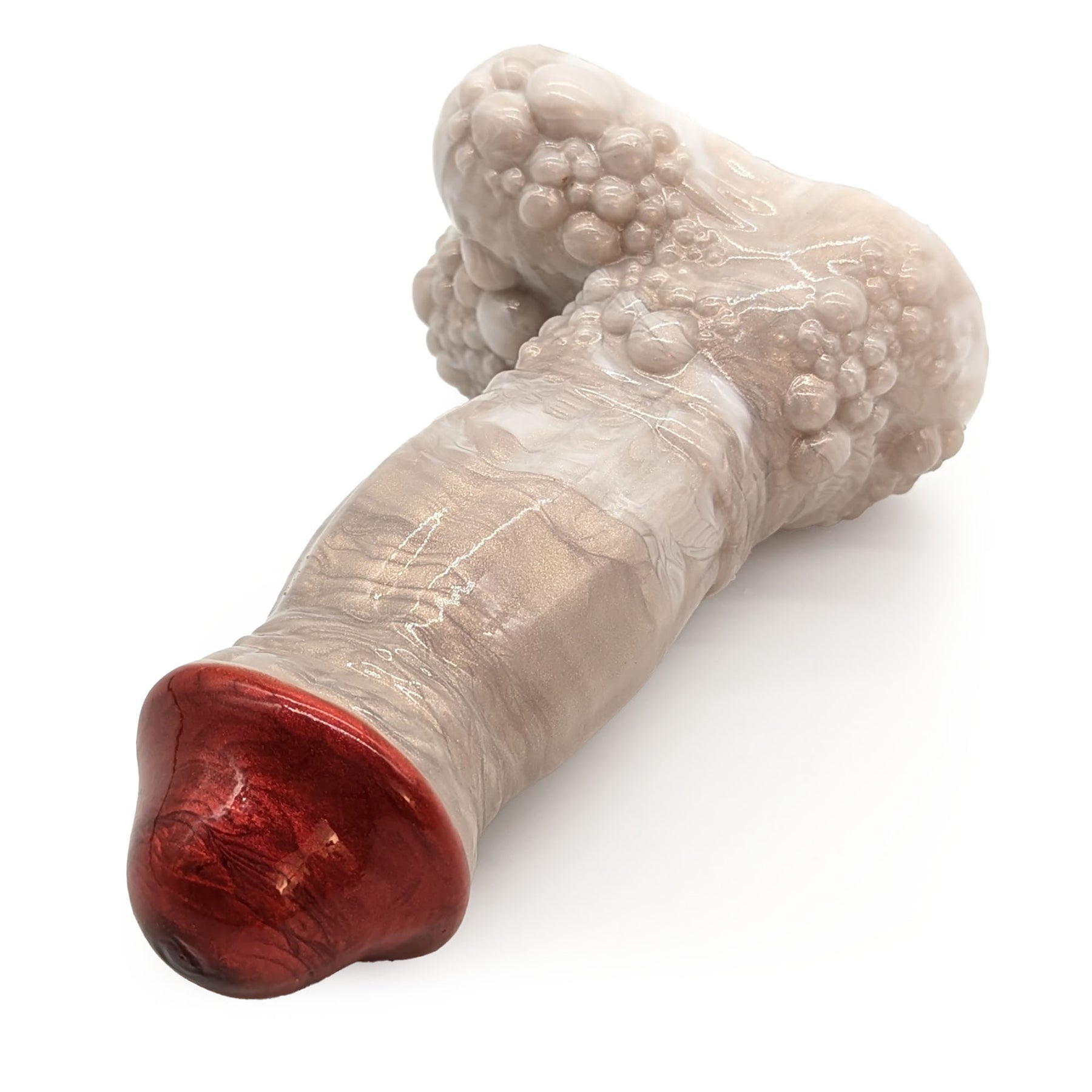 His thick, ribbed shaft is slightly curved with a gentle mid-shaft swell for some delicious push and pull. He ends in a fanciful carpet of mini-shrooms for added external stimulation.