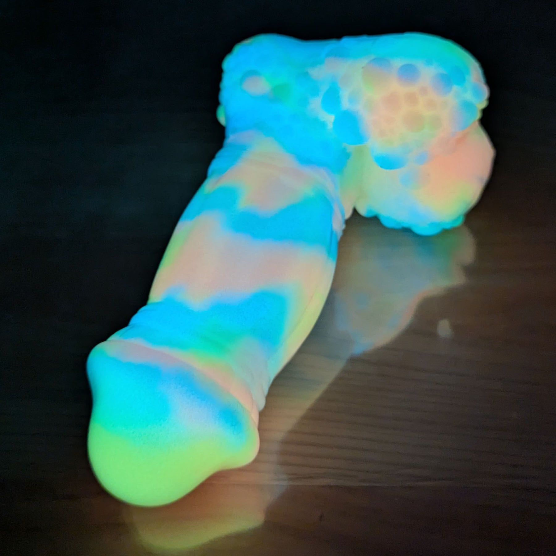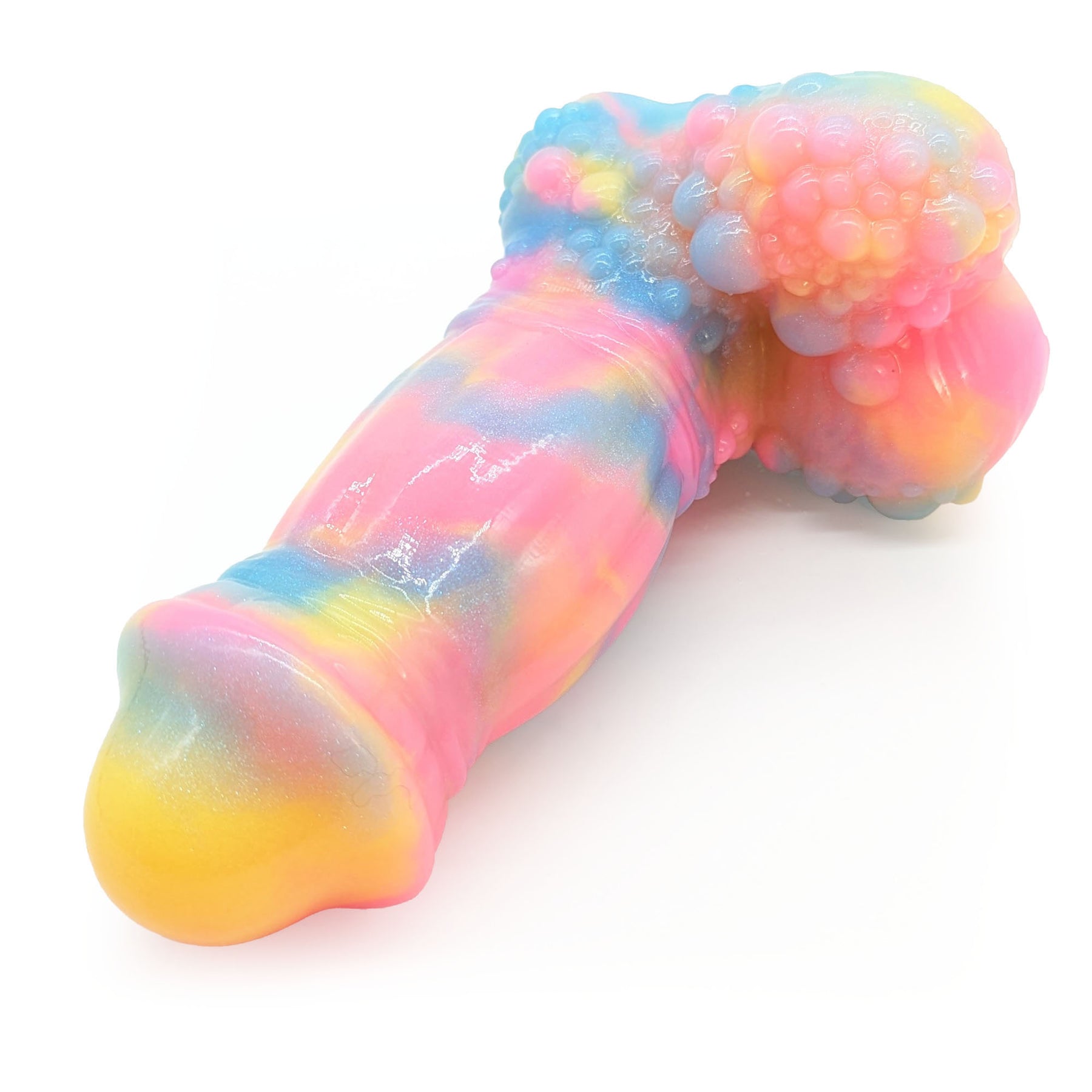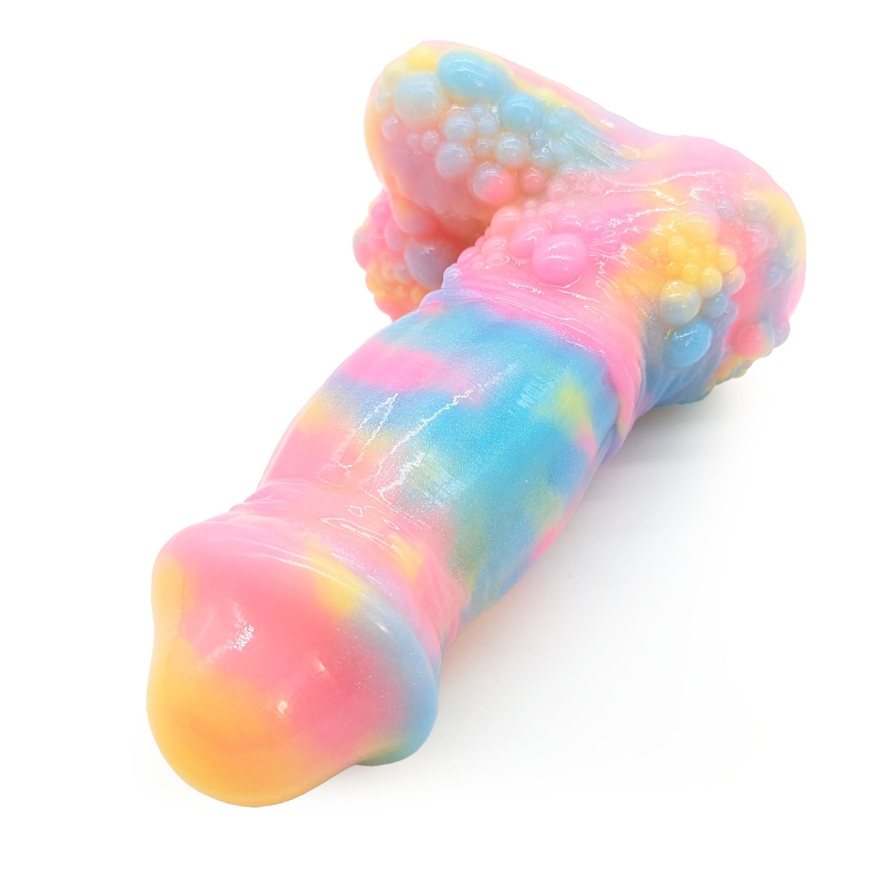 His thick, ribbed shaft is slightly curved with a gentle mid-shaft swell for some delicious push and pull. He ends in a fanciful carpet of mini-shrooms for added external stimulation.