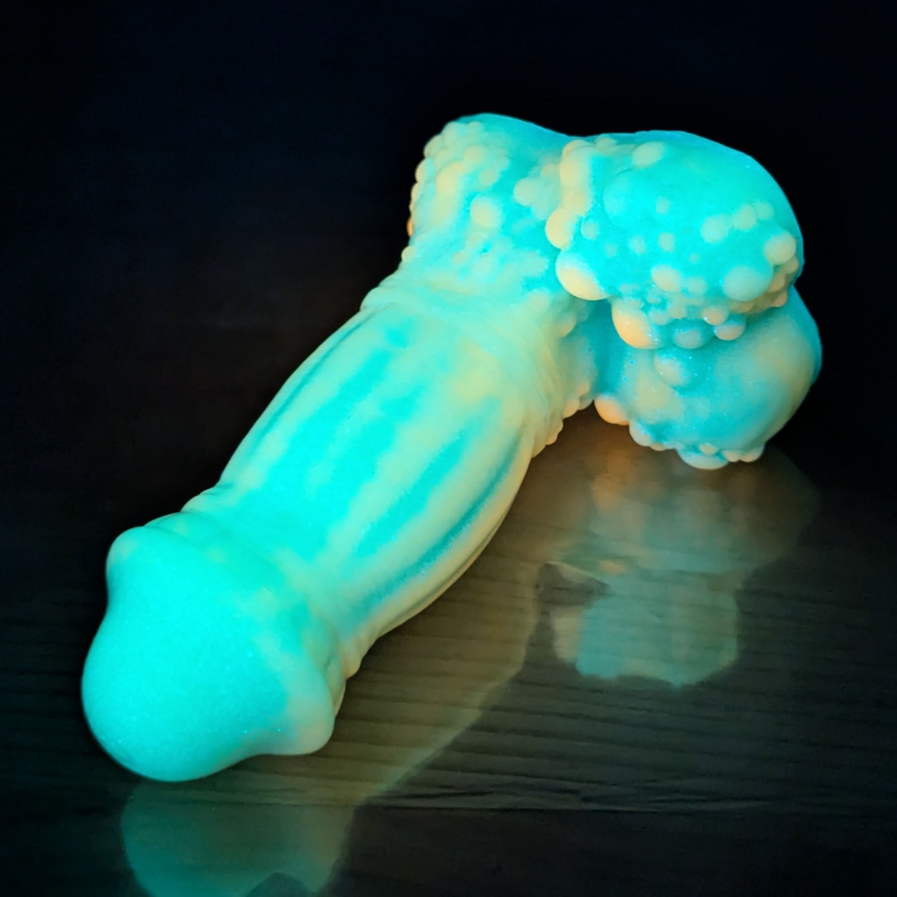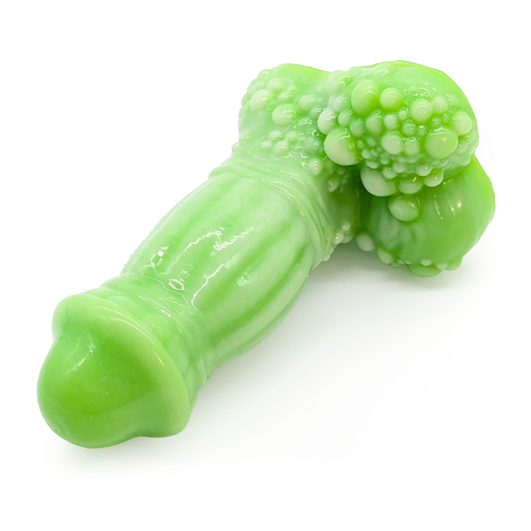 His thick, ribbed shaft is slightly curved with a gentle mid-shaft swell for some delicious push and pull. He ends in a fanciful carpet of mini-shrooms for added external stimulation.
