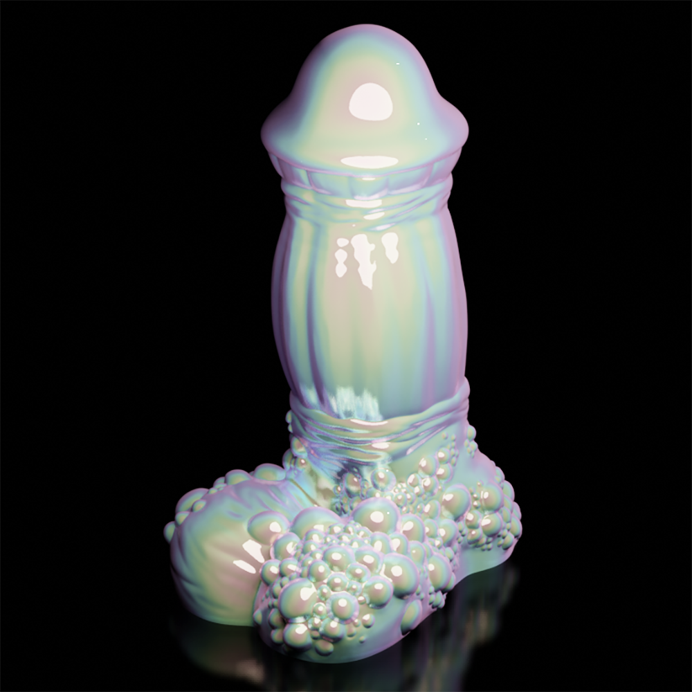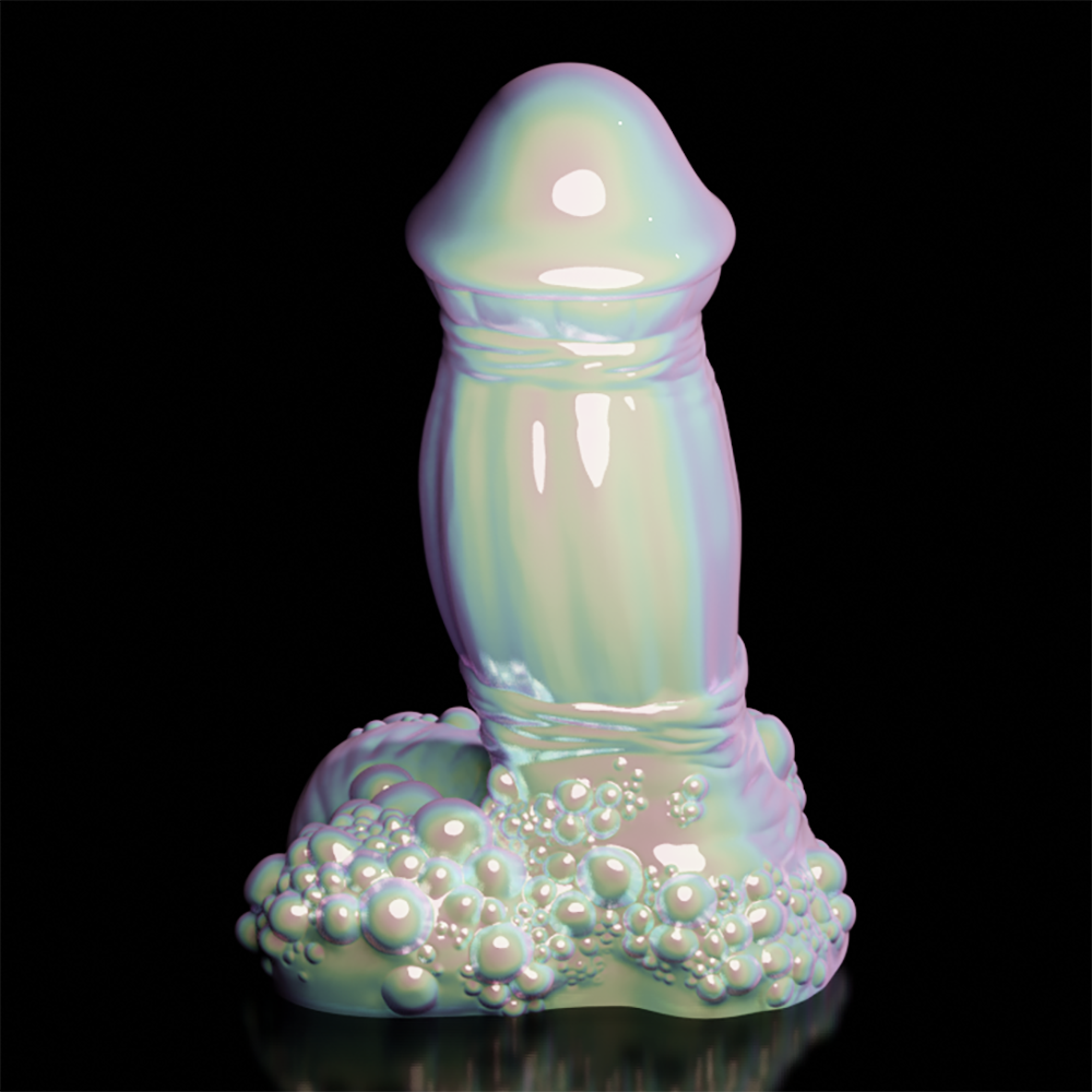 His thick, ribbed shaft is slightly curved with a gentle mid-shaft swell for some delicious push and pull. He ends in a fanciful carpet of mini-shrooms for added external stimulation.