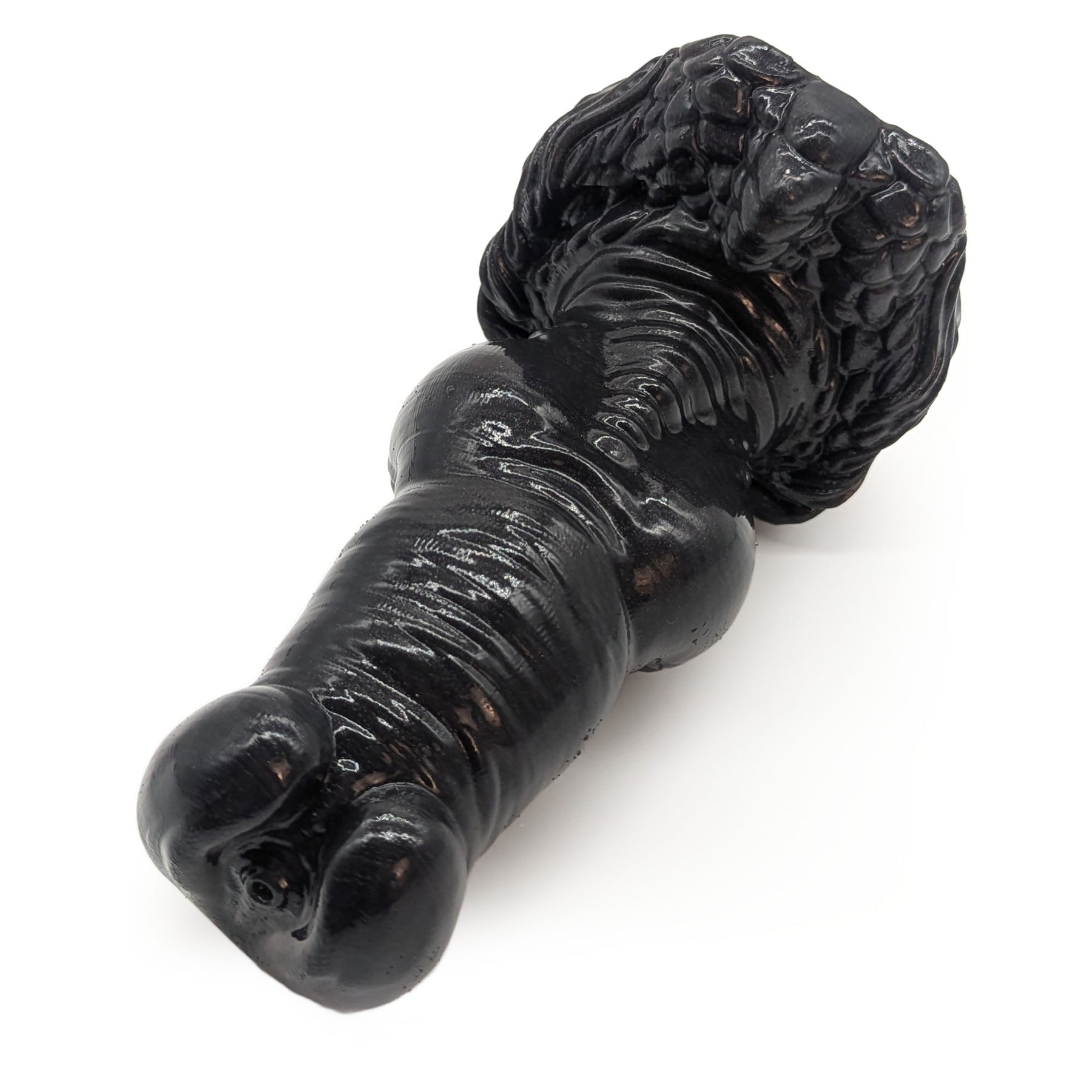 The Nue’s extremely blunt, rounded head leads to a lightly textured upper shaft with a soft swell followed by a thick, spherical knot and ribbed post-knot shaft. His intricately detailed base features rows of stimulating scales to grind on.